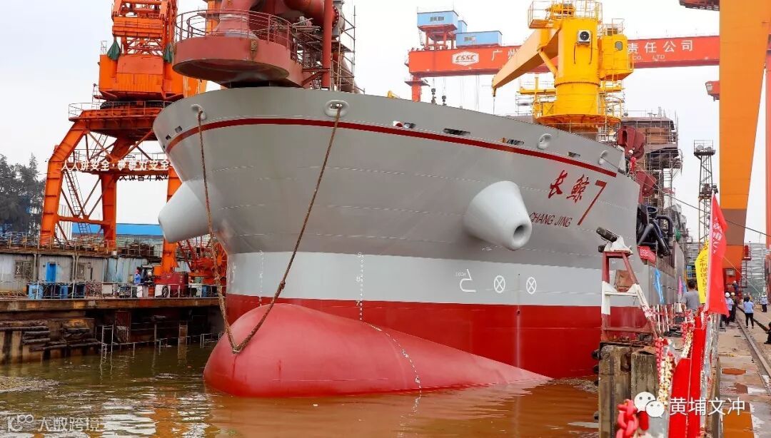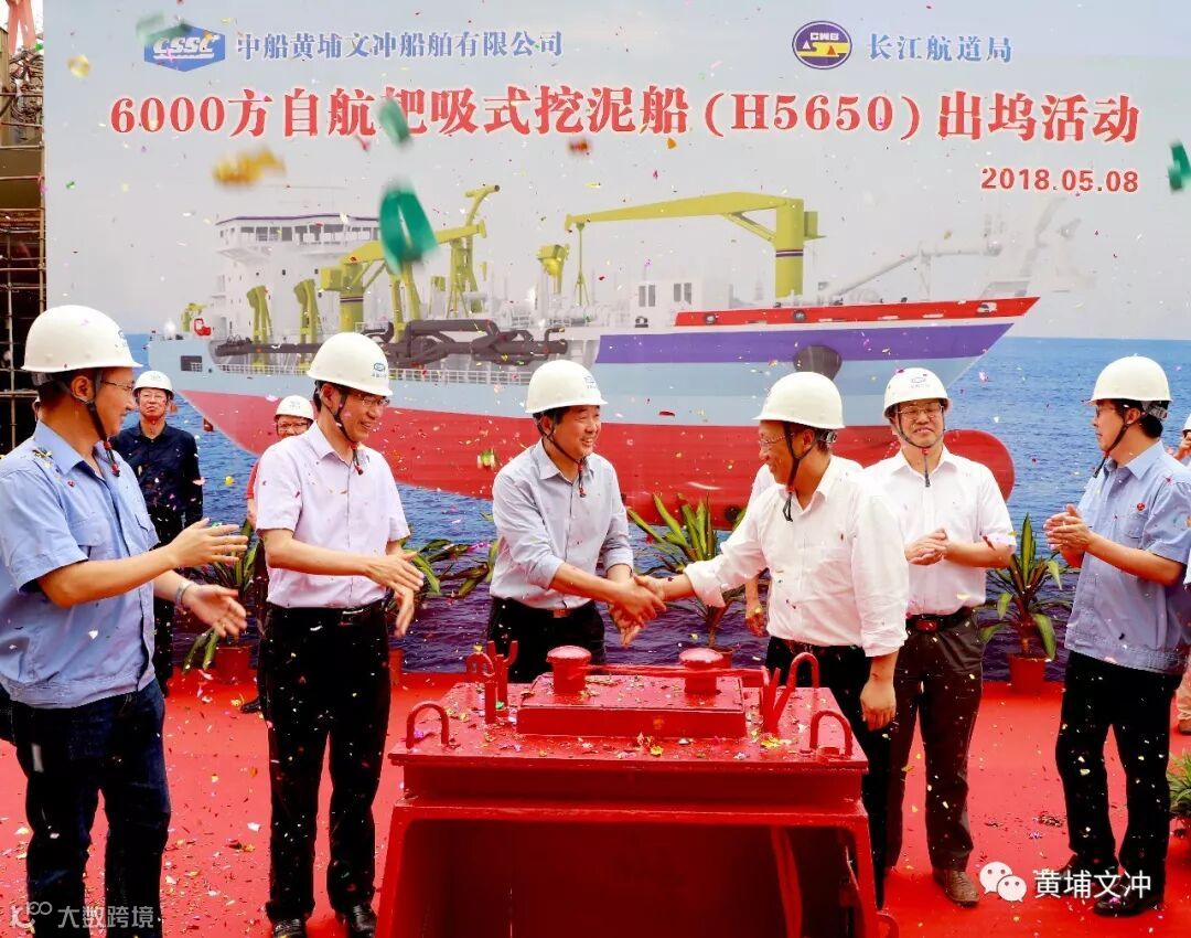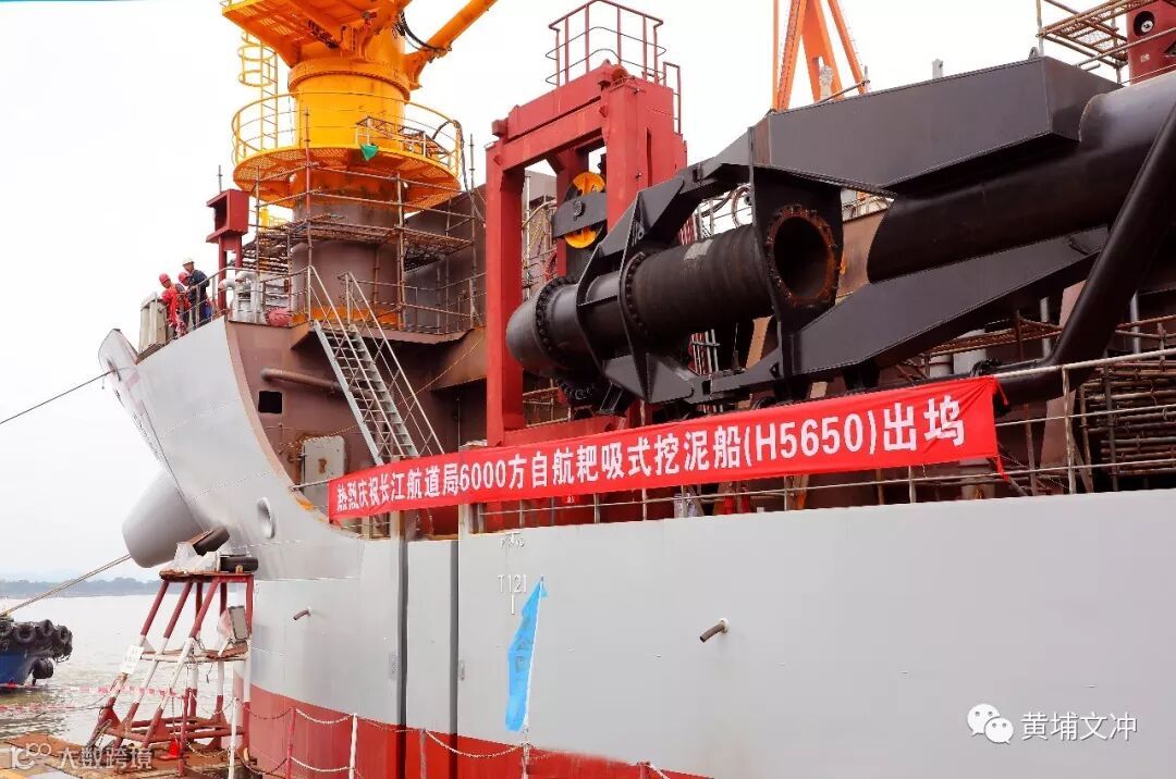 当日,亚洲第一艘全电力驱动的6000方自航耙吸式挖泥船H5650在中船黄埔文冲船舶有限公司文冲厂区顺利出坞。
