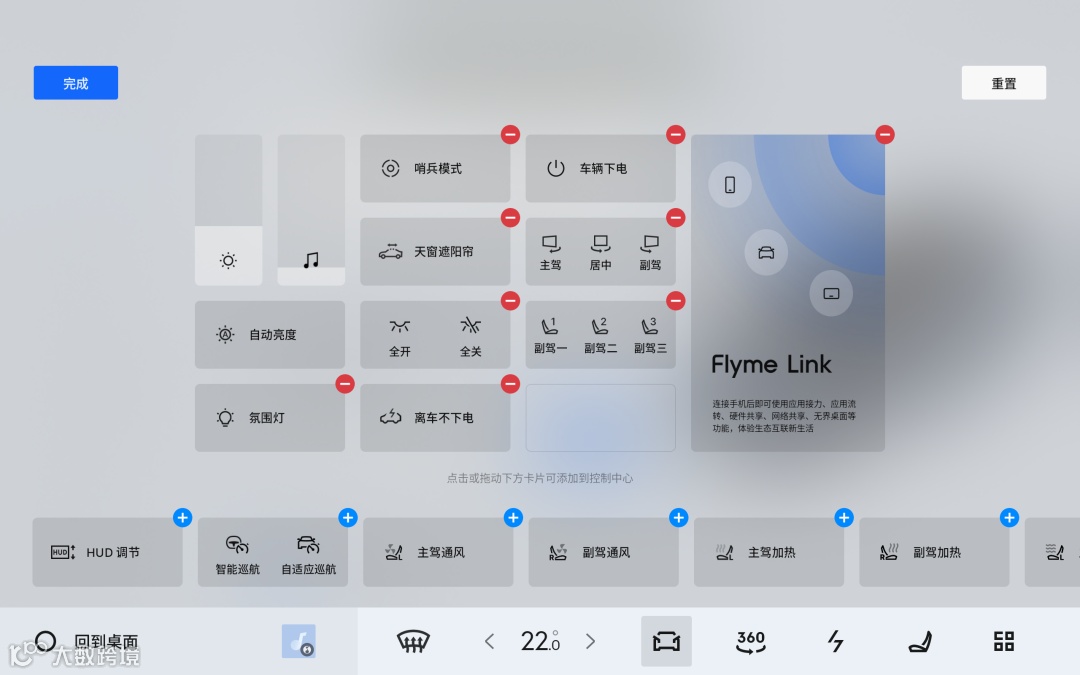 领克07 EM-P车机的下拉菜单具备至多23个常用开关,用户可通过自己的驾驶习惯进行编辑调整。