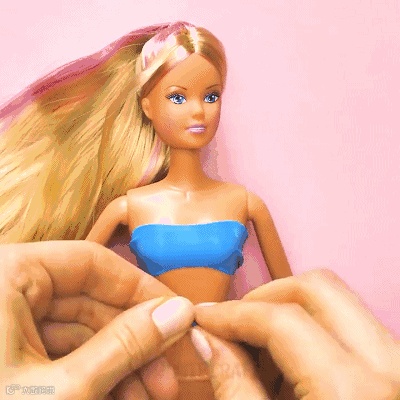 步骤3:宽橡胶圈套在芭比娃娃的上身,窄橡胶圈从宽橡胶圈中间穿过,挂在芭比娃娃脖子上,上衣就完工啦。