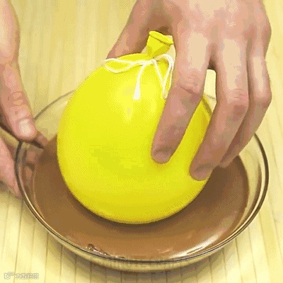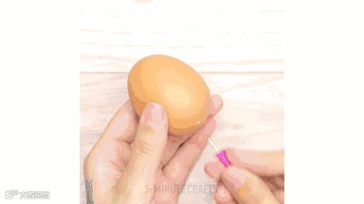 在生鸡蛋相对的两侧各扎一个小孔,充气的气球对着其中一个孔缓缓撒气,受气压的影响,浓度较低的生蛋清就会从另一边的小孔里破壳而出。