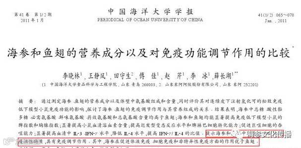 通过测定海参、鱼翅的营养成分以及体壁中氨基酸组成和含量, 同时评价其对连续皮下注射氢化可的松致免疫 低下模型小鼠免疫功能的影响, 探讨了海参、鱼翅的免疫调节作用与其营养组成的关系。结果表明, 海参中总糖、酸性黏 多糖、必需氨基酸、鲜味氨基酸、药效氨基酸和总氨基酸含量均高于鱼翅; 海参和鱼翅均能显著提高免疫低下模型小鼠的 脾指数和胸腺指数; 显著提高小鼠血清溶血素含量; 提高迟发型变态反应水平和脾淋巴细胞转化能力; 促进巨噬细胞的吞 噬能力; 显著提高血清中 IL3、IFN水平, 降低 IL4 水平, 提高 IFN/ IL4 的比值。提示海参和鱼翅中均含有全面的免 疫活性物质, 具有免疫调节作用。其中, 海参在促进体液免疫、细胞免疫和非特异性免疫方面的作用优于鱼翅。-----摘自中国海洋大学学报《海参和鱼翅的营养成分以及对免疫功能调节作用的比较》