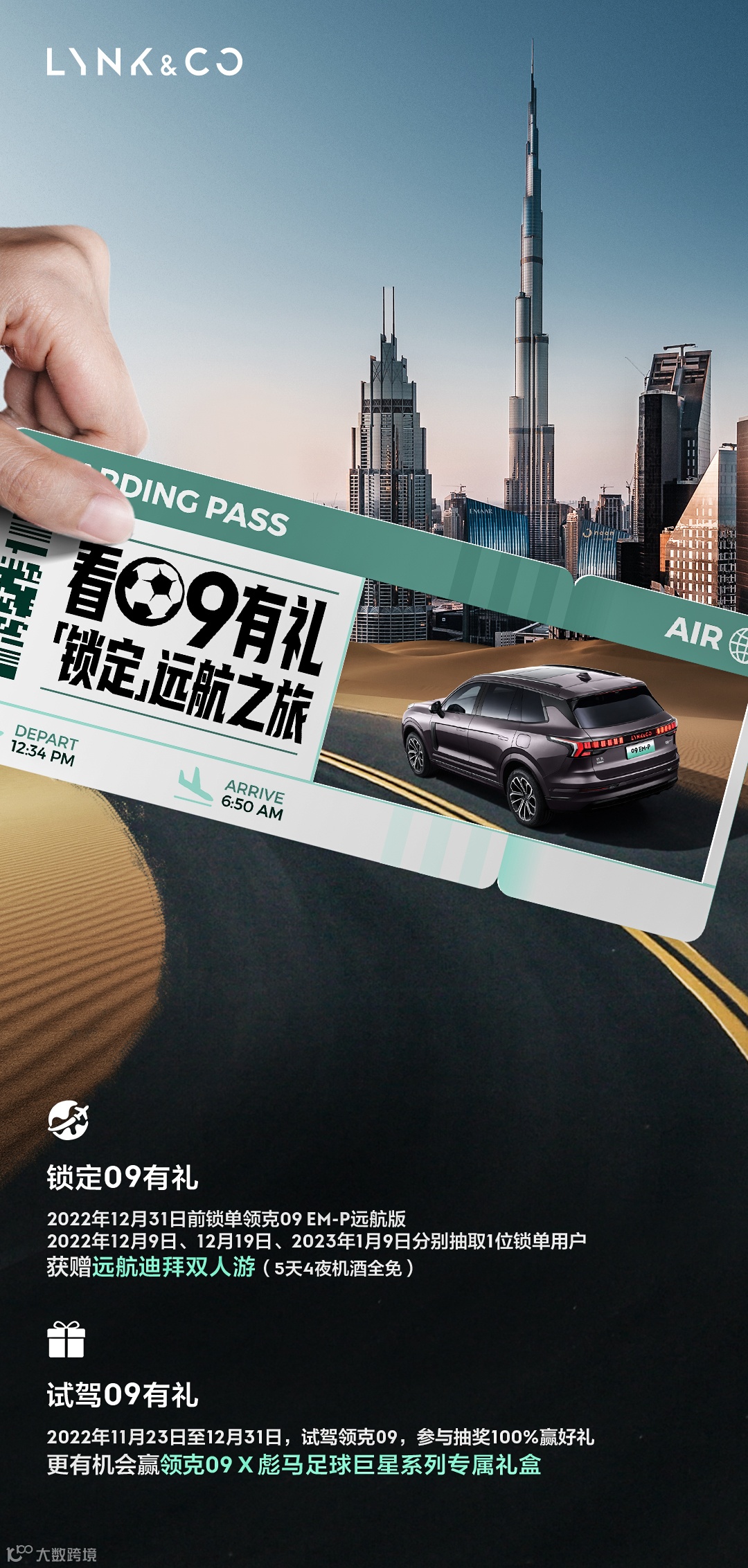 活动截止前,用户锁单领克09 EM-P远航版,均有机会参与抽取【远航迪拜五日双人游】大奖。