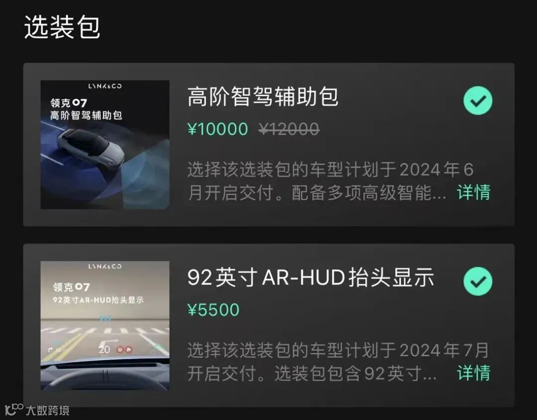 在您大定锁单后,我们将根据您选择的版型进行车辆生产、匹配及发运。其中“高阶智驾辅助包”和“92英寸AR-HUD抬头显示”选装包均需要在生产时进行硬件预埋及软件匹配,若您在下订时没有选装,后期将无法进行加装的操作。因此,建议您在大定锁单前根据个人需求充分考虑,再进行版型配置的确认,完成大定锁单的操作。