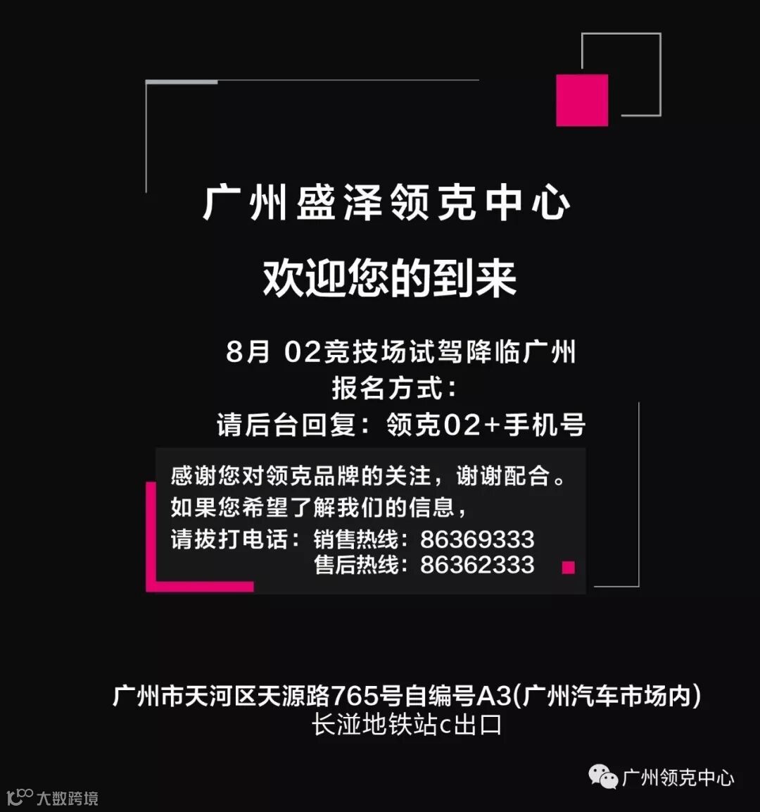 Hi,广州盛泽领克中心【天河领克中心】欢迎您! 领克汽车—新时代高端品牌。销售热线:8636 9333,24小时救援电话 :189 222 53053,客服电话:8636 9396。 地址:天河区天源路765号【地铁6号线长湴站C出口】。