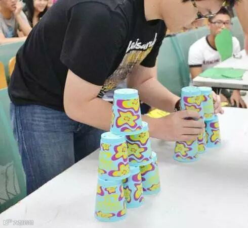 你要以最快的速度,把上边的杯子,照着中间显示的叠法,把杯子叠出来。