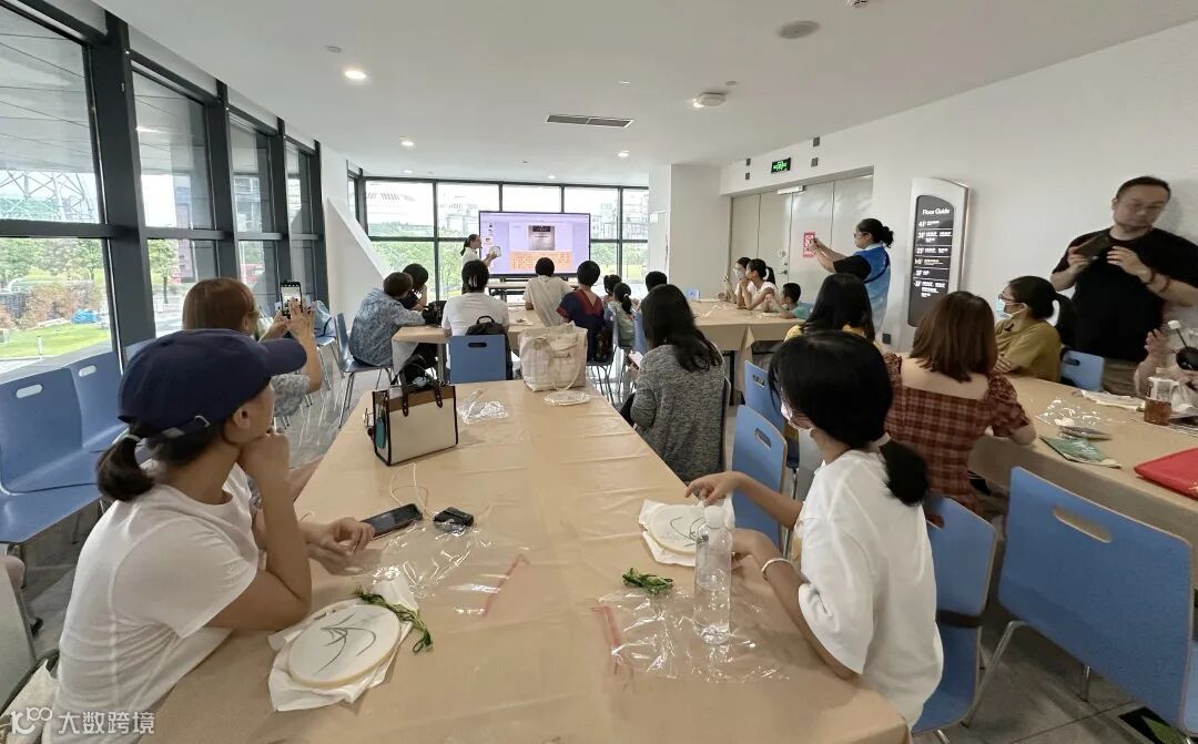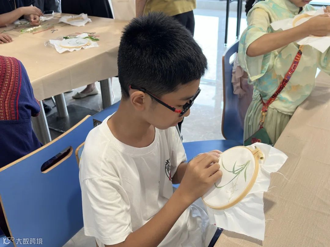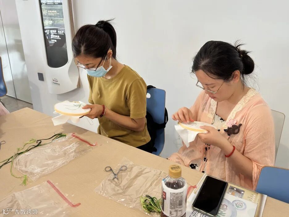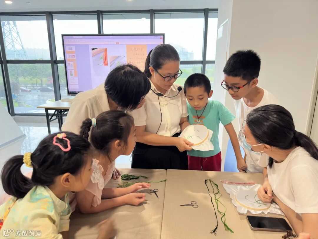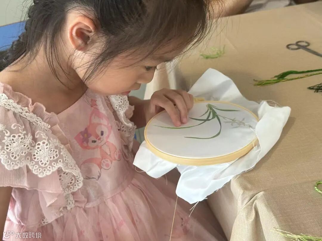 初步了解广绣后,参与者需要使用几件简单的材料和工具——一个绣绷、一枚绣针、几缕丝线和一把剪刀,尝试绣出兰花的图案,并学习和体验广绣的针法。
