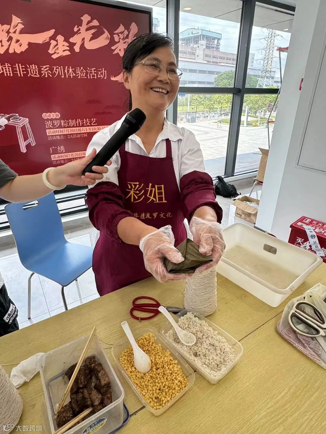 波罗粽制作技艺市级非遗代表性传承人陈玉彩,从事波罗粽制作已有20多年,常被亲切地称呼为“彩姐”。活动当天,彩姐作为主讲人,分享波罗粽的历史、特色与制作技法。