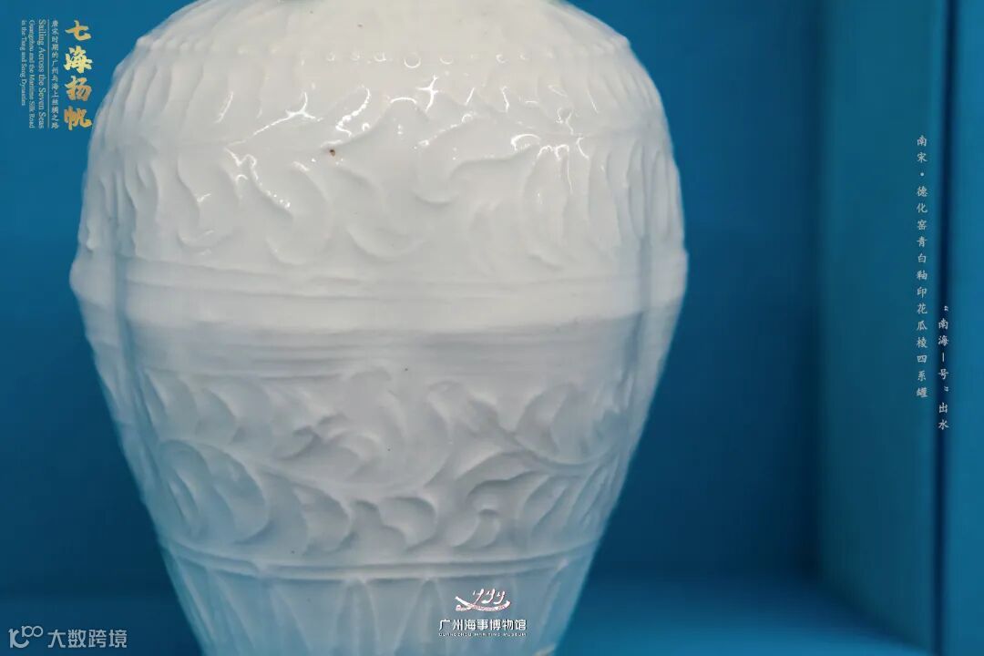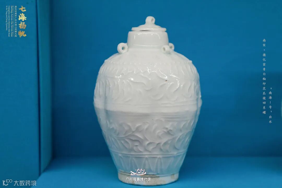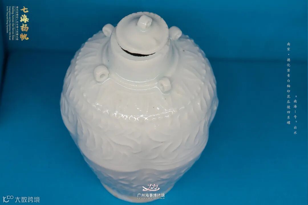 【德化窑青白釉印花瓜棱四系罐】,直口方唇,颈部有两两对称的四系,溜肩,四系外一圈印花弦纹,肩部一圈印花连珠纹,弦纹连珠纹间为一圈印花花瓣,器身印有折枝草叶纹。鼓腹,最大腹径处素面,下腹斜直,近底处露胎,釉胎以弦纹分开。釉色白净、明亮。罐内有四小瓷瓶,一定程度上反映了古代远洋瓷器贸易中货物的原始摆放状态。