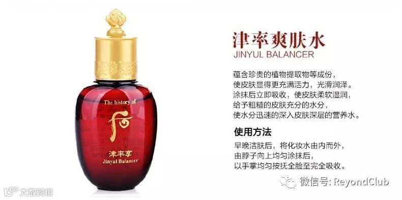 津率面霜:本产品是涂抹性卓越的韩方津液膏。它那湿 润感可一直保持到第二天早晨,帮助皮肤循环,使津液 渗透到皮肤深层,打造充满弹力、亮丽的皮肤。