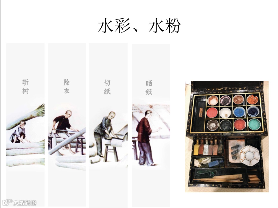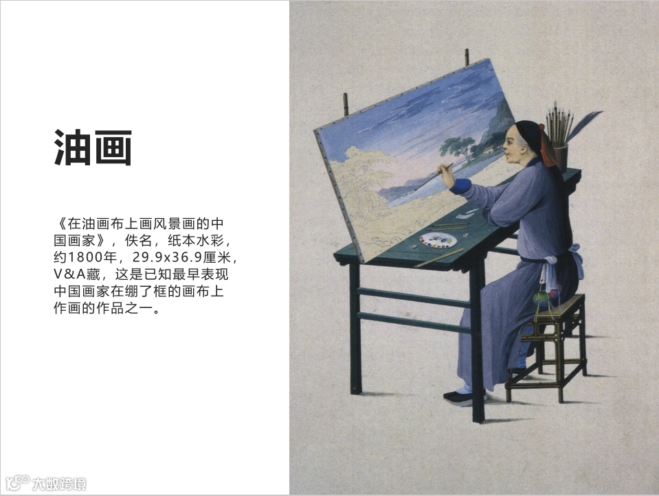 就画材的调适来说,中国传统的绘画使用的是笔墨纸砚,而西方则有油画、水粉、水彩等等不同的绘画的种类。18-19世纪,广州的外销画家会通过拜师学艺或者临摹的方式去学习借鉴。