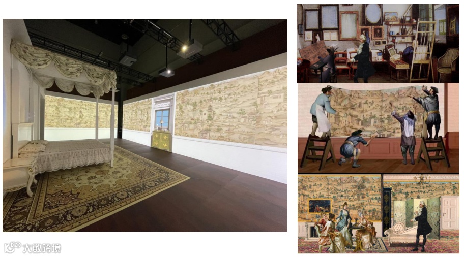 此次展览多处运用投影融合技术,还原欧洲贵族小亨利一家人在哈伍德庄园的生活起居,打造沉浸式庄园生活体验场景。并且从壁纸中选取20个人物、风景等图像制作成木偶动画,动态呈现18世纪的广府风貌和人们生产生活的场景,还通过三段动画,让观众了解外销壁纸从生产到销售再到安装的全过程。
