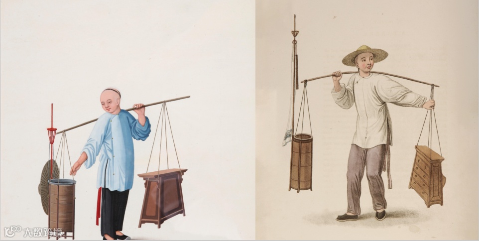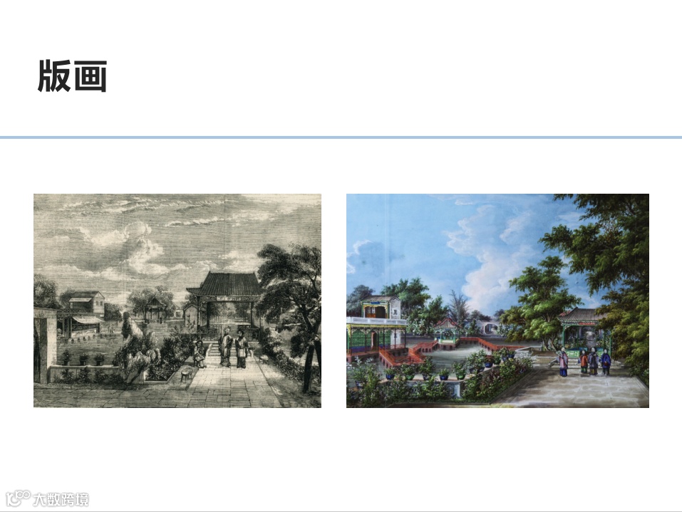 通过两幅风景画,可以看出,左边广州外销画作品更注重对细节的刻画,与右边西方画家波尔热的作品相比较,二者无论在构图还是绘画技法上都是非常接近的。