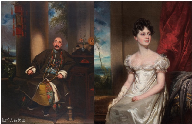 这幅女性肖像,是乔治·钱纳利的绘画作品,左边是中国外销画大师林呱的作品。两幅作品在风格上非常接近。首先是构图,从室内视角描绘室外景物;然后人物,用了3/4的侧面坐姿;光影上达到了立体的效果。这些都显示出了林呱对钱纳利的绘画的技法掌握达到了炉火纯青的艺术造诣。