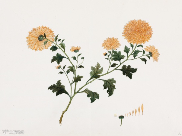 外销画中的植物画可以说是最符合最贴近中国传统工笔画的。18世纪的西方,兴起了一股博物学的风潮。中国的传统工笔画能够精细描绘植物的枝叶,非常符合西方博物学的需求。为了迎合这种需求,这些画家不单精细地画出植物的颜色、外形,也对植物进行了具体构造的描绘,包括花蕊、花苞、花瓣等,实现了植物画方面的调适。