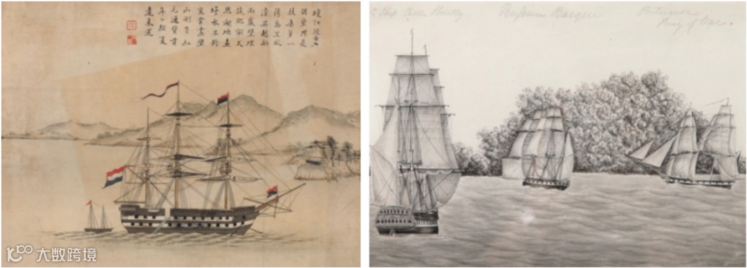 左边是中国的画家画的一艘荷兰东印度公司的商船,右边则是西方画家画的船舶的速写。左边的船舶画运用到了焦点透视中近大远小的原则,在描绘远山树木的时候,又用到了中国传统的绘画技法,还使用了落款和题跋等,有着中国传统绘画的风格。