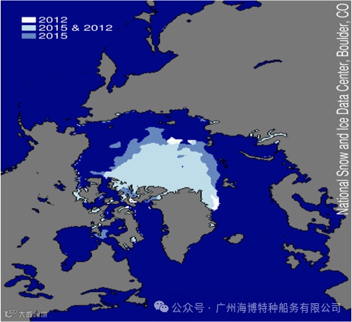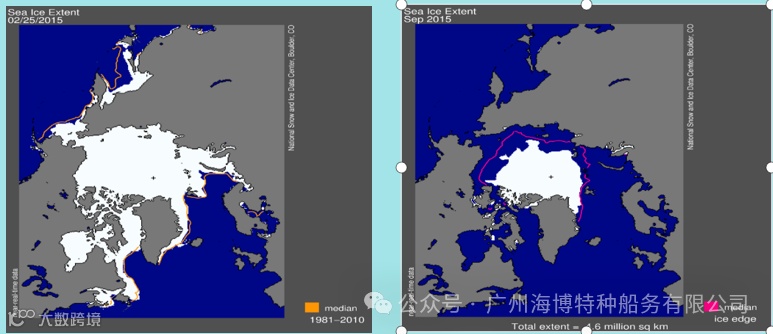 2015年2月25日海冰范围最大(左)和2015年9月11日海冰范围最小(右),彩色线为1980-2010年同日的平均值。冬季为历史最低值;夏季为历史第4低值。