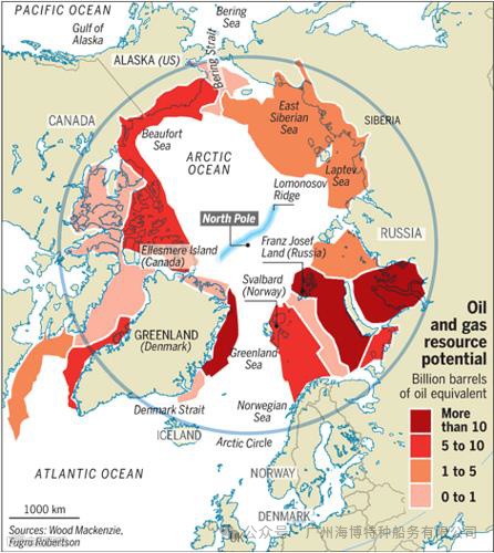 北极重要的航运价值、资源价值、环境价值和科学价值因为海冰融化而得以释放,而资源类占全球资源的20%。