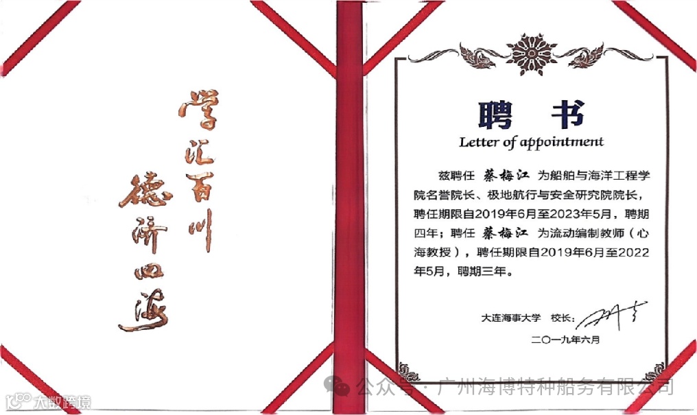 2018:获聘哈尔滨市工程大学兼职教授;中国航海学会极地航行与装备专业委员会常务主任委员;上海海事大学研究生企业导师;