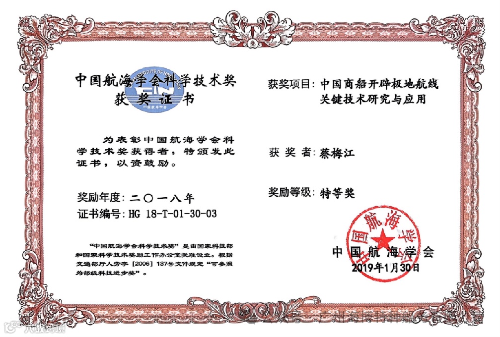 2018:项目《中国商船开辟极地航线关键技术研究与应用》主要参与人,荣获中国航海学会科学技术进步特等奖;