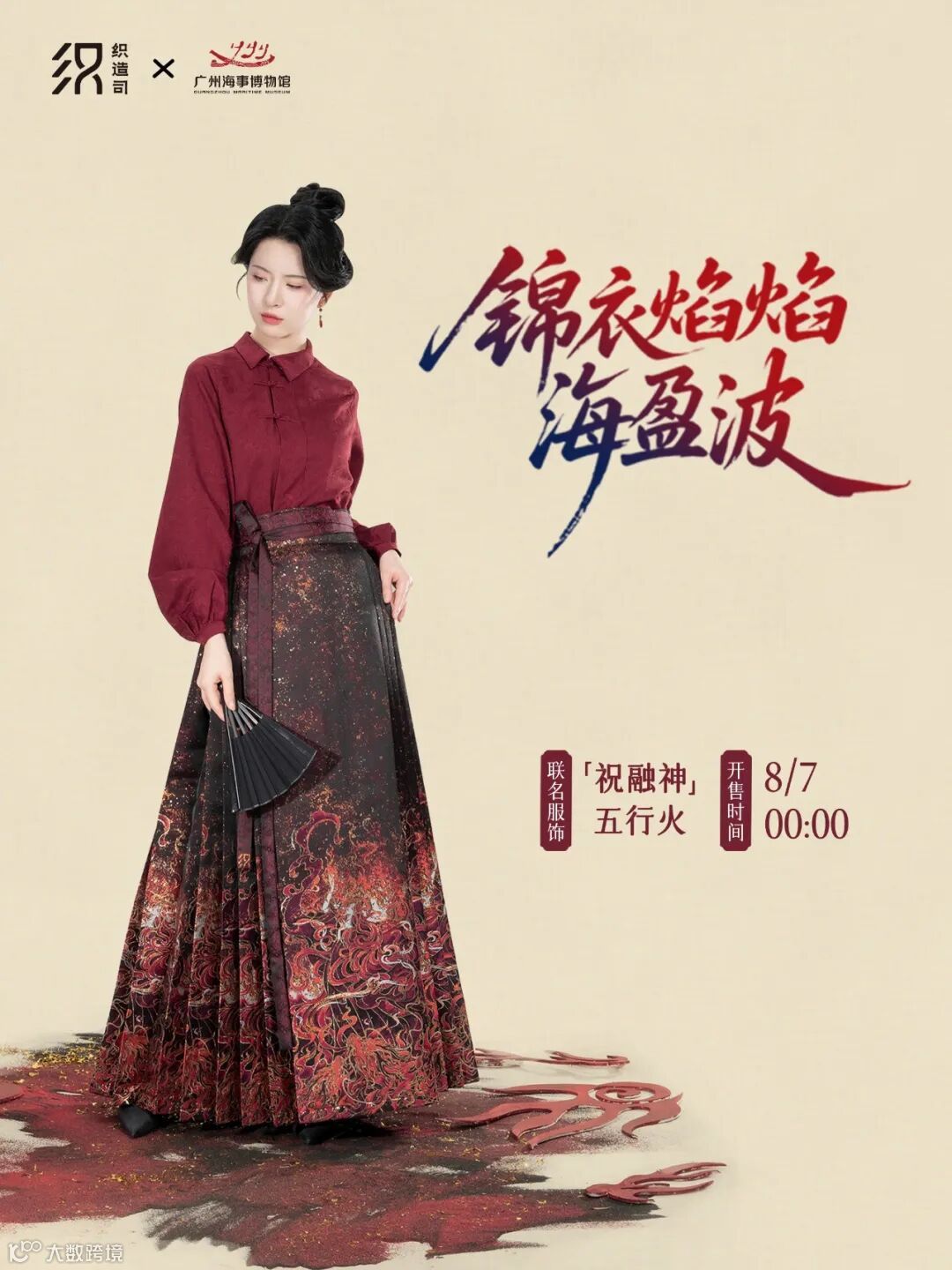 本次联名服饰,由织造司携手广州海事博物馆,以非遗云锦织造【五行火】主题马面裙,以史籍中的祝融形象为灵感,增彩千年商都海丝文明。