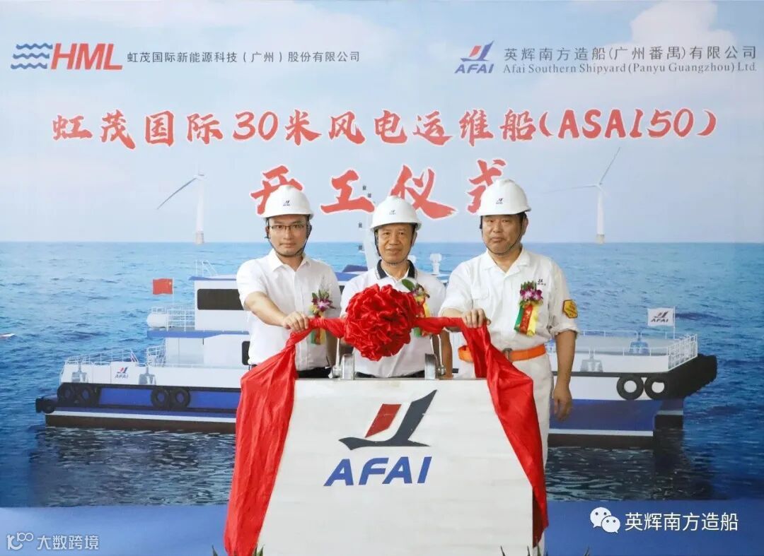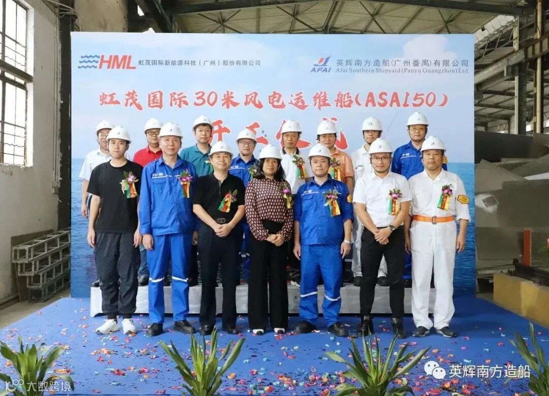 2023年8月10日,英辉南方为虹茂国际新能源科技(广州)股份有限公司设计建造的30米级风电运维船举行开工仪式。虹茂国际新能源科技(广州)股份有限公司董事长沈金华、总经理郭于贵,中国船级社广州分社入级检验处副处长韦文杰,英辉南方总经理陈晓亮出席仪式。