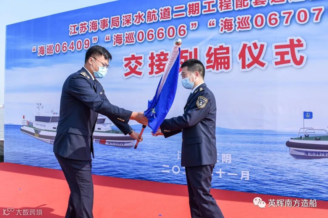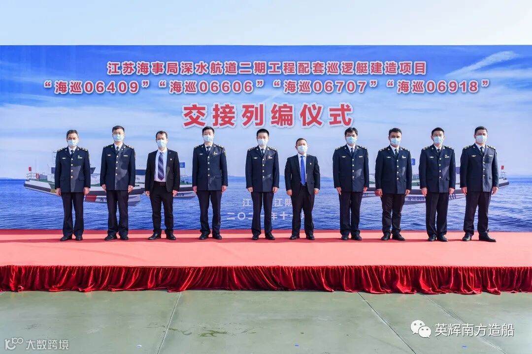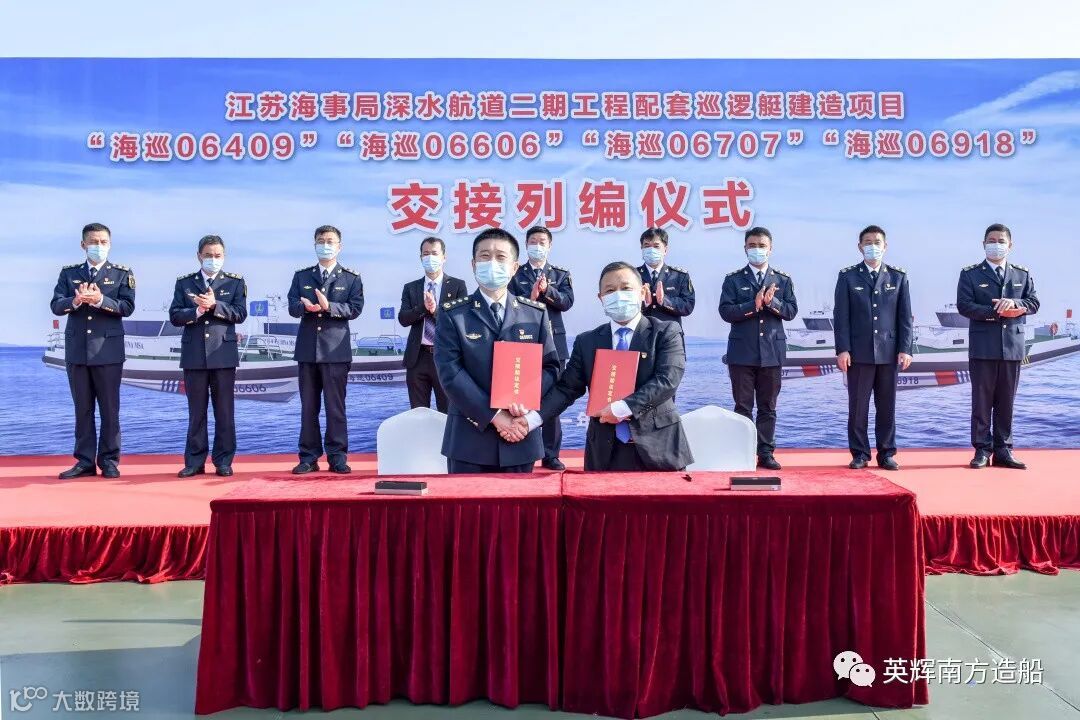 英辉南方韩兵副董事长表示,2020年7月15日,中国船舶集团与交通运输部海事局在京签署战略合作框架协议。协议强调双方将在海洋装备制造业和海事监管领域加强战略互联、政策互通、技术标准对接,共同加快建设交通强国、海洋强国。这四艘巡逻艇的成功交付,正是英辉南方与江苏海事局共同践行该合作协议的具体表现。船舶设计建造期间,面对疫情的严重影响,英辉南方不讲条件,展现央企的责任担当,提质量,保交期,精心设计,精细施工,在江苏海事局的大力帮助和支持下,实现了4艘巡逻艇的高质量交付。