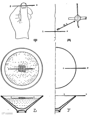 北宋科学家、政治家沈括在《梦溪笔谈》中,也记载了四种指南针装置方法演示,书中记载了水浮、指爪、碗唇和缕悬等四种方法:
