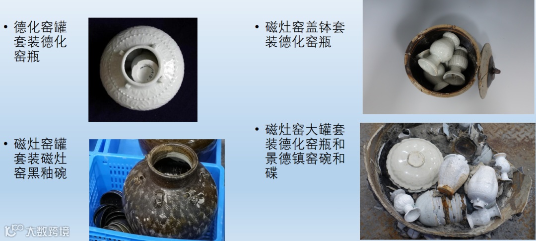 福建德化窑和磁灶窑瓷器都有大件套小件的情况,同时磁灶窑还有大罐套装其他窑口甚至混装其他不同窑口产品的情况,这与宋代海外贸易商船为充分利用空间“货多陶器,大小相套,无少隙地”的文献记载相吻合,而磁灶窑的大罐套装德化窑甚至混装德化窑和江西景德镇窑瓷器的现象,只有在船货集散地才能实现,而这个集散地最有可能的就是距离磁灶窑不远的泉州港附近。