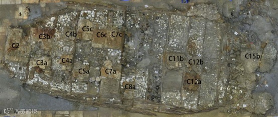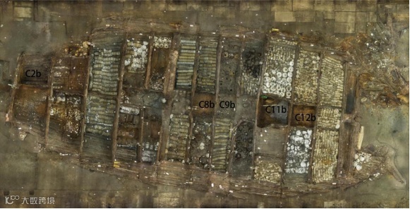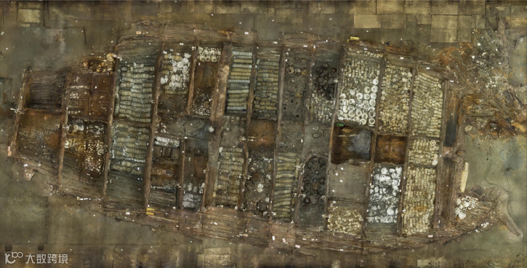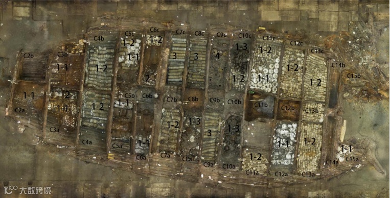 从图可以看到,在考古发掘“南海I号”的时候发现,船舱有14道横向的木隔板,把船舱分左右不同的区域,共分割成14个船舱。,船舱的中间有薄的木板进行内部的隔断。在考古发掘的时候,也会依据从左舷到右舷的顺序来编号。各种窑口的瓷器堆放只是相对集中的码放方式,但是在其他船舱也会出现零星少量的码放。