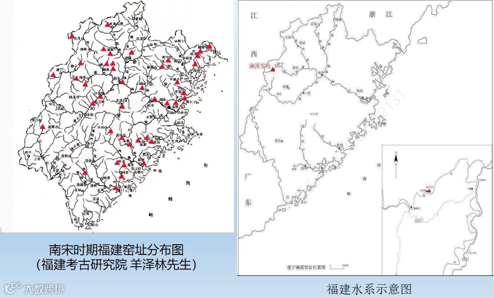 根据福建考古研究院栗建安、羊泽林先生对福建窑址的考古发掘和研究成果,南宋时期窑址遍布福建三大水系,河流是窑业生产的必备条件,同时也是瓷器产品运输的重要交通通道。从福建水系示意图上可以看到,闽江上游分别连接北部的浙江龙泉窑和西北部江西景德镇窑,两者产品经水路运至泉州港集散非常便利。