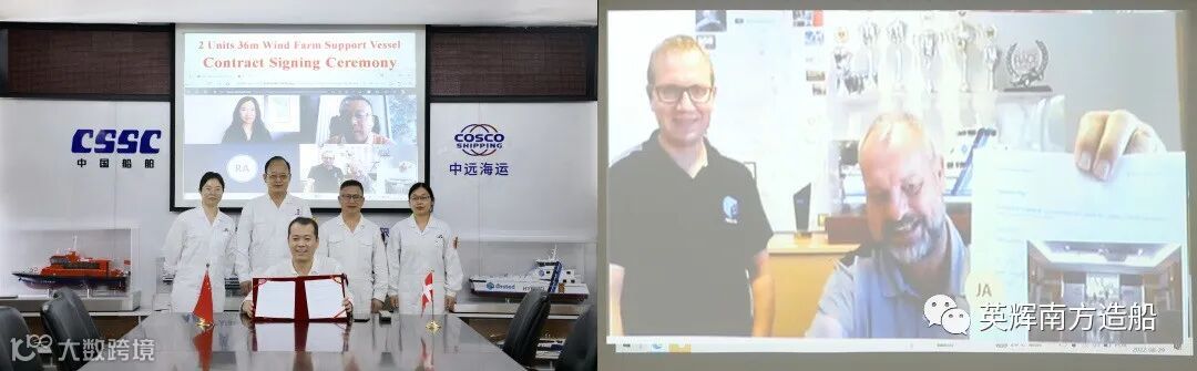 2022年8月29日,英辉南方造船(广州番禺)有限公司与丹麦MHO海上风电运维公司签订两艘高端风电运维船合同,这是英辉南方继2021年交付两艘丹麦高端风电运维船后的再次与 MHO公司合作,也是英辉南方承接的第4艘和第5艘交付欧洲的高端风电运维船,奠定了英辉南方在海上风电高端运维船领域的领先地位。本次与欧洲船东再续前缘,体现了国外客户对英辉南方的认可和信任,充分彰显了“英辉南方”在国际高性能铝合金船舶市场上的品牌认可度和知名度。