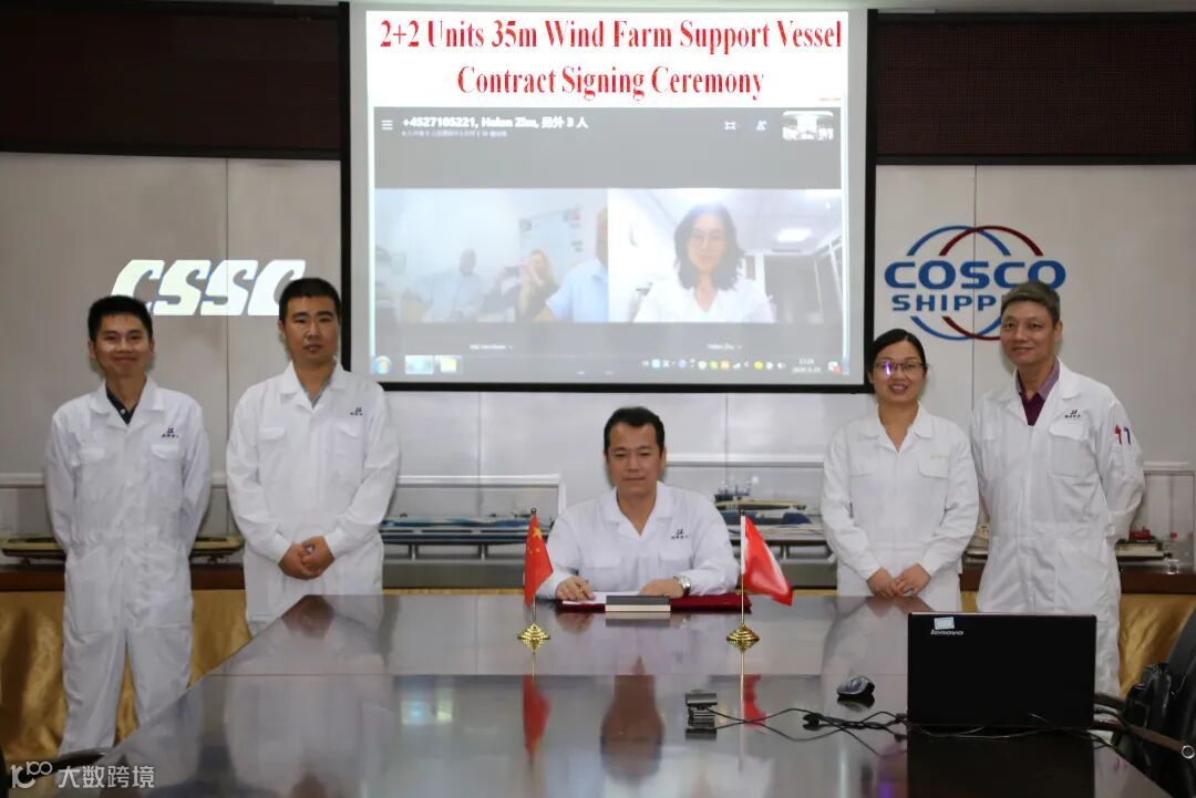 该船东通过“云考察”的方式对英辉南方进行了严格的审查,对英辉南方的国际业绩和建造质量给予充分肯定和信任。船东通过“云谈判”的方式与英辉南方进行了技术和商务谈判,通过“云签约”的方式在广州和丹麦两地签订了该项目的建造合同,这是英辉南方近两年接到第二份国际风电运维船订单!签约仪式上,英辉南方总经理陈晓亮先生与船东代表签署了该项目的建造合同。