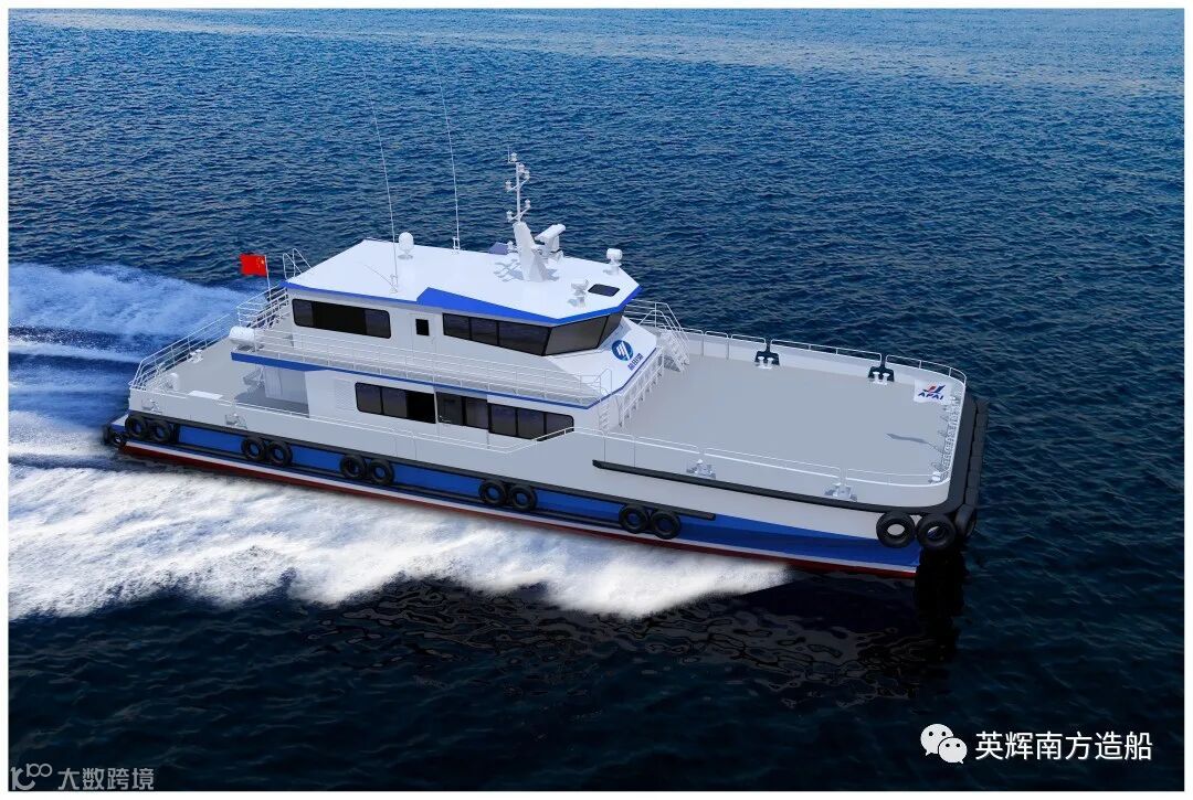 该项目船舶总长30.25米,总宽9.50米,型深3.30米,吃水1.7米,设计航速25节,船型选用英辉南方的新型优化船型。该船型可有效减少船体在波浪中的运动响应,使船舶抗浪能力达4米,具备在2.5米浪高情况下安全顶靠海上风电桩的能力,具有良好的适航性、耐波性、快速性、操纵性和安全性。该船舶交付后将为船东拓展业务,进军风电运维市场提供强有力的支撑,为海上风电运维作业提供更可靠的安全保障。