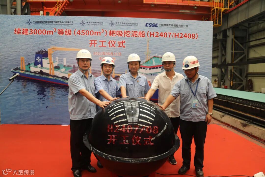 6月11日,中国船舶集团黄埔文冲公司为上海航道局中港疏浚有限公司建造的2艘4500方耙吸挖泥船H2407和H2408正式开工。本次仪式以“云开工”形式进行,中交上航局、中港疏浚、疏浚技术中心、4500联合监造项目部、708研究所、CCS、黄埔文冲公司领导及嘉宾参加活动。