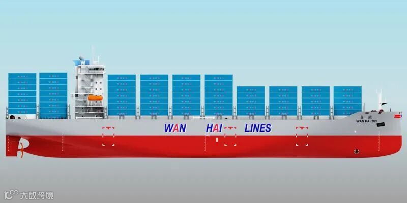万海2038TEU项目,由上海船舶研究设计院设计,该型船船长175.0m,型宽28.6m,型深16.5m,设计吃水9.5m,结构吃水10.5米,约23400载重吨,服务航速20.5kn,续航力10000海里,悬挂新加坡国旗,拥有卓越的燃油经济性及贴合船东航线需求的适货性。