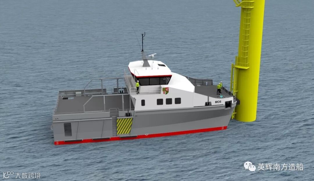2018年5月21日,英辉南方成功签订了一艘新型全铝合金专业风电运维船合同。该风电运维船长25.43米,宽11米,可装载6名船员并运送24名工程技术人员,甲板设计载货量达到50吨,远超出国际同类型船舶。该船型经过了为期四年的研究和设计优化,相比传统的风电运维船,其高海况适航性、安全性、承载能力和效率有着显著的提升,同时,该船配备了固定式螺旋桨驱动,在保证船舶使用效率的同时,降低了建造和使用成本。目前同类船型在英国北海水域的风电场使用效率高、操作稳定,为客户带来了良好的经济效益,受到客户的一致好评。