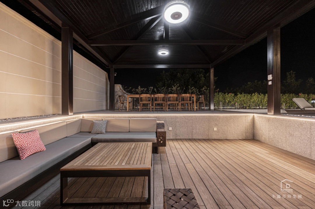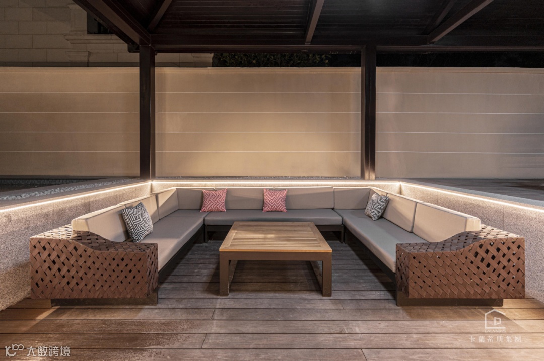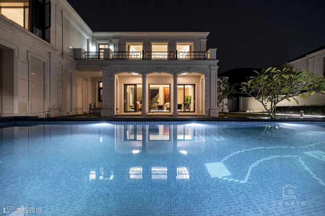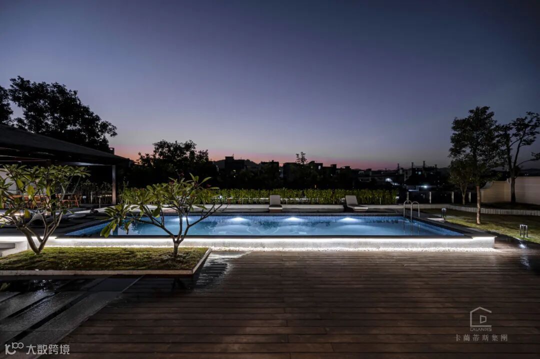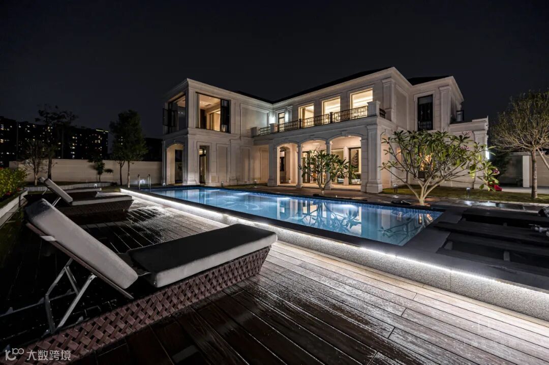 庭院是一个巨大的游泳池,既可以为一家三口提供一个娱乐欢愉之地,又让那一汪蓝仿佛镶嵌一般融于周围景色。绿植的点缀与池水灯光搭配的恰到好处,夜幕下水天呼应,充满生机。设计师用现代手法将法式的浪漫结合一一水景、端景,构建一个“大隐于市”的雅致生活圈。