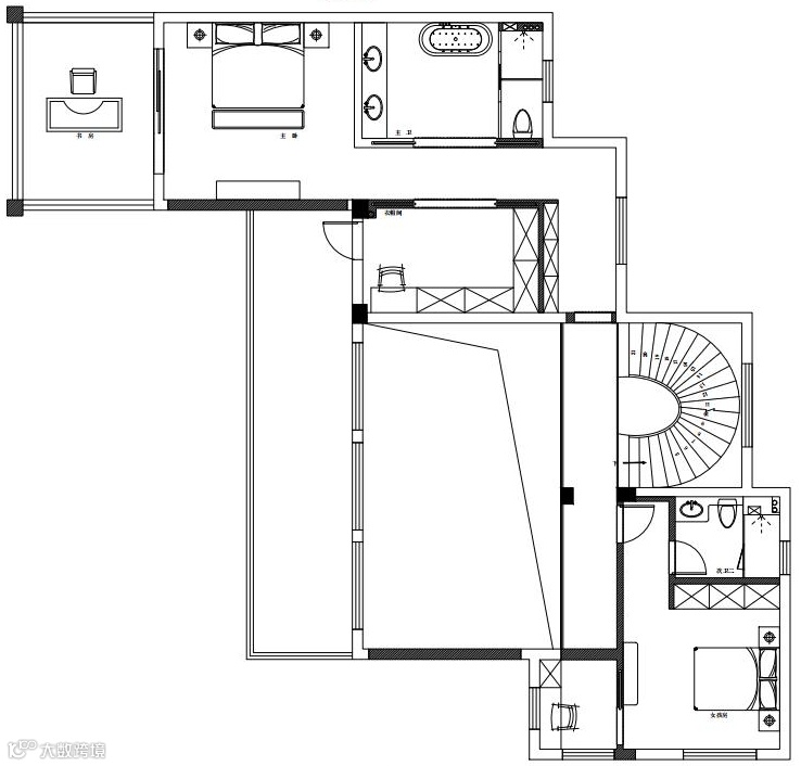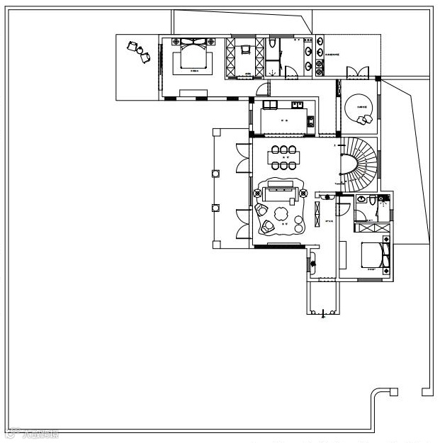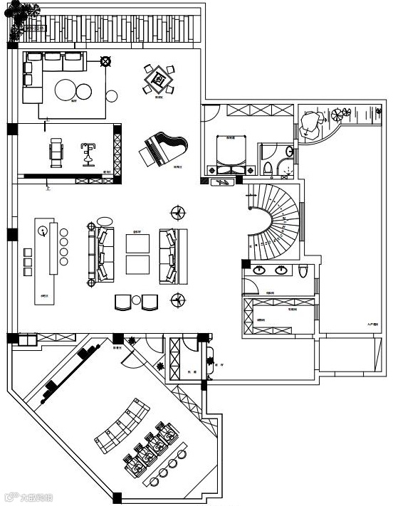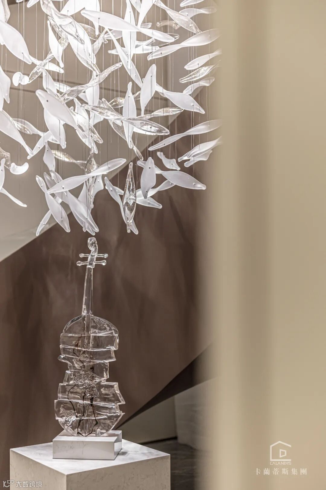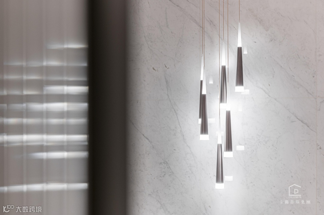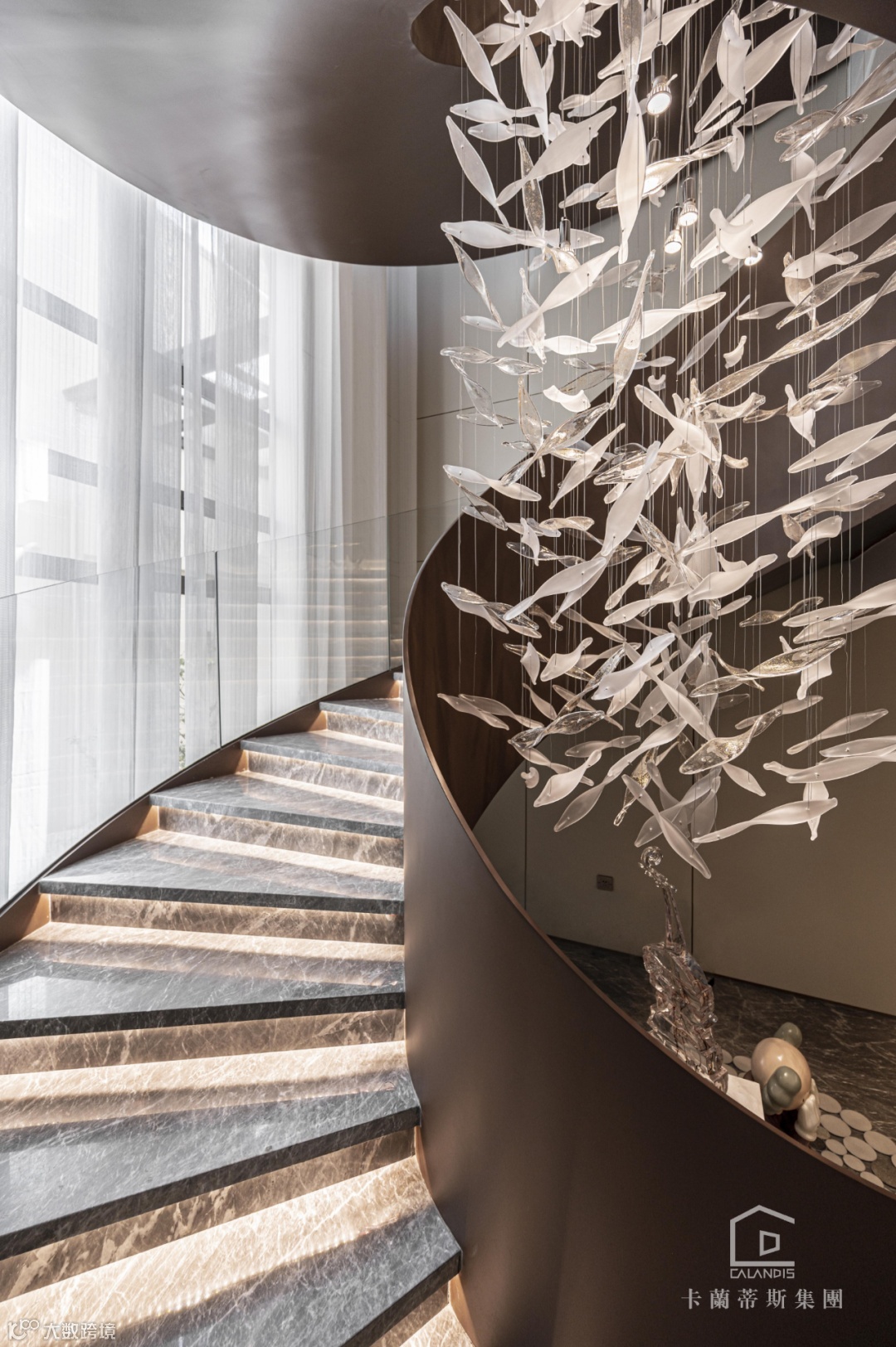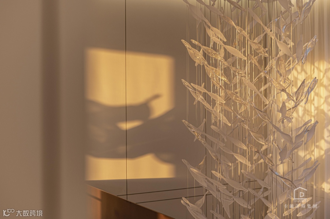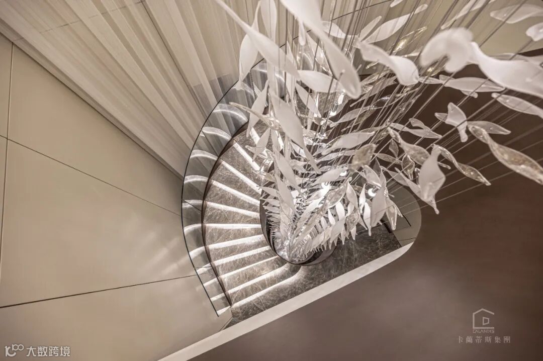 旋转楼梯的点睛,螺旋状由上至下逐步递减的主灯,造型由“鱼”简化现代手法寓意深远.将光与水凝固于此,当窗外的光线打进来,映照在玻璃和木材及结构型材上,二维世界与三维世界的碰撞,虚幻与现实的交叉,带来一场美妙的对话。