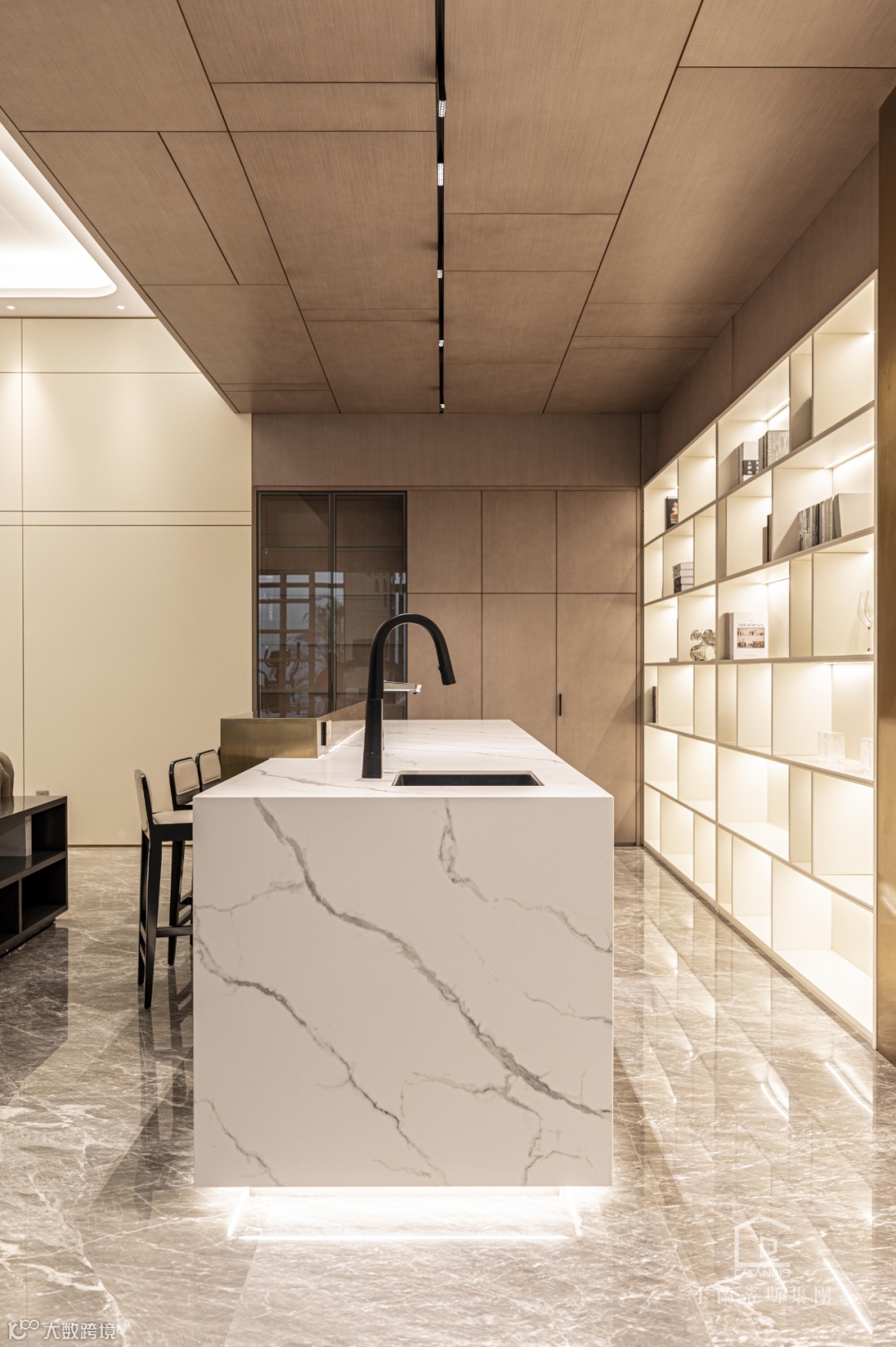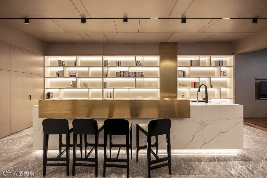 沙发后面就是岛台,闲暇之余可以作为操作台沏杯咖啡,洗洗水果很是方便。黄铜自带光效的金属感,与轨道灯相配合,使整体空间视觉上更加开阔,岛台底部的灯光,也使整体更具氛围感。