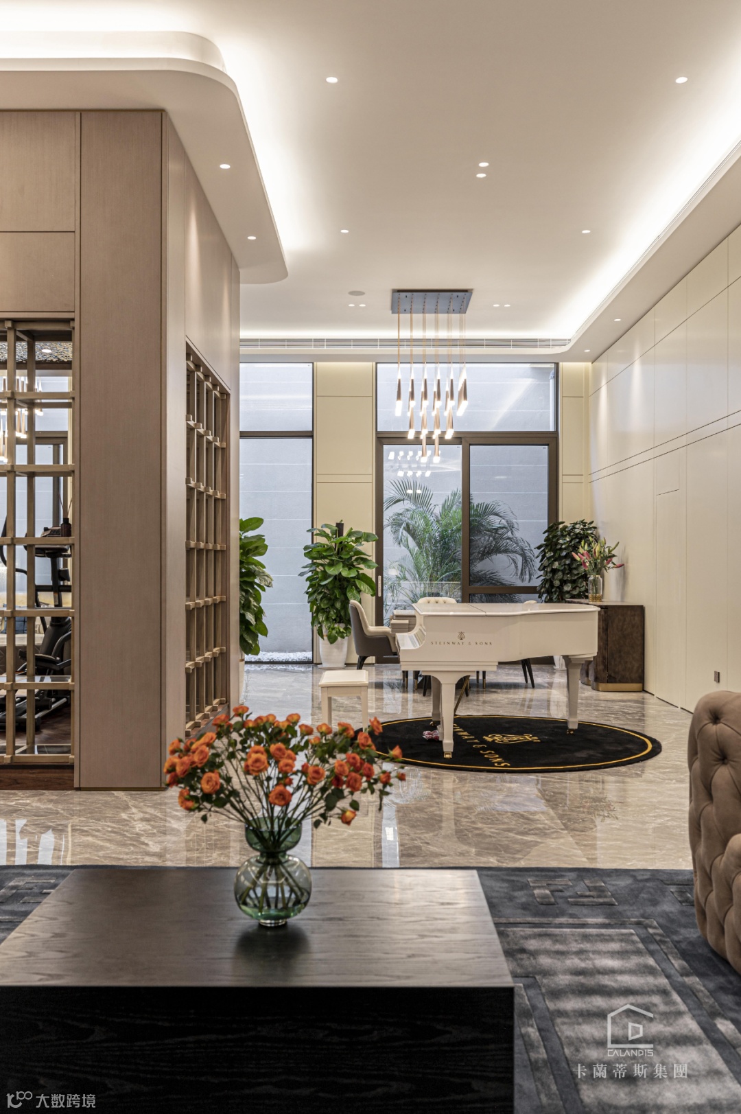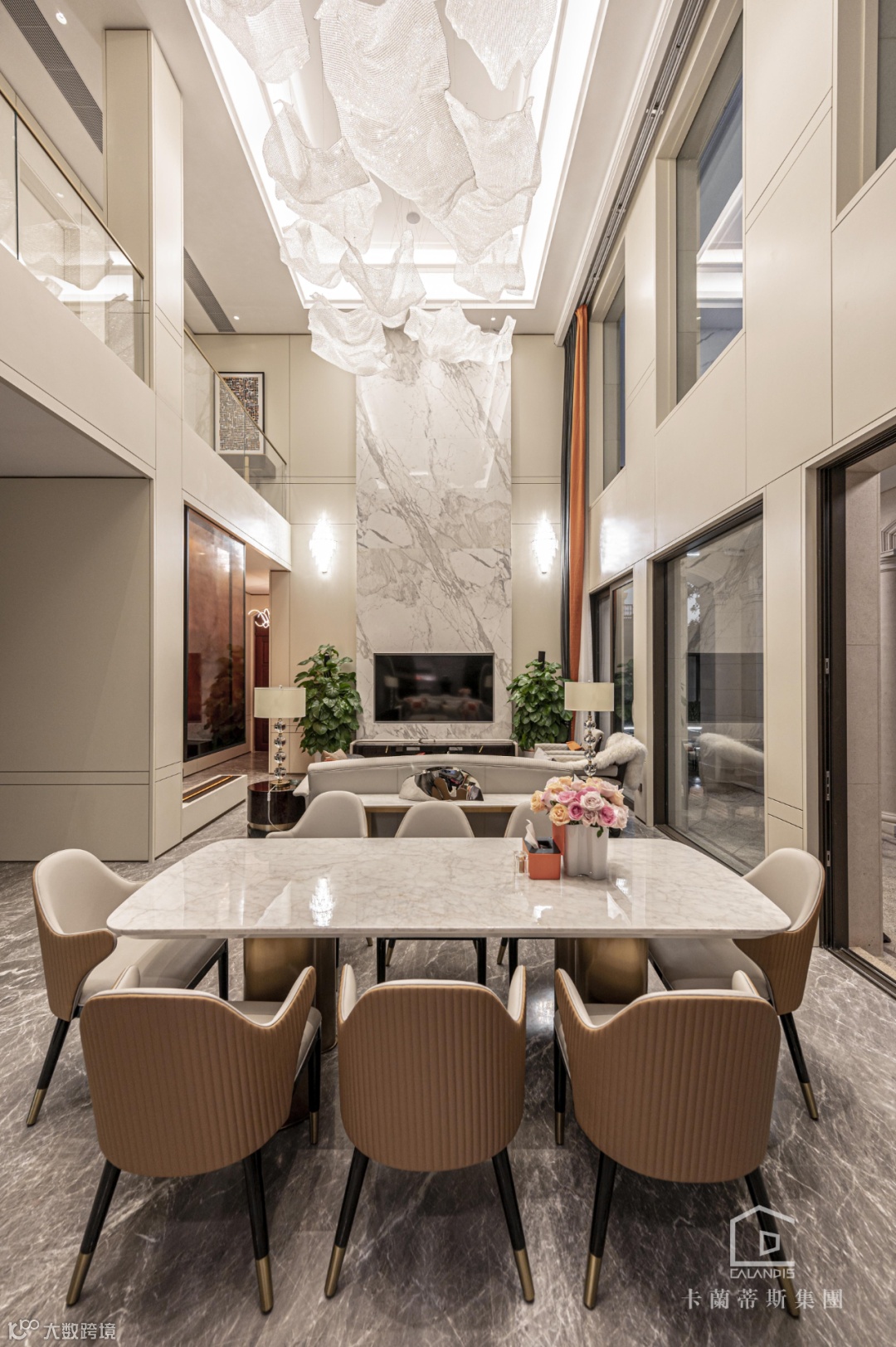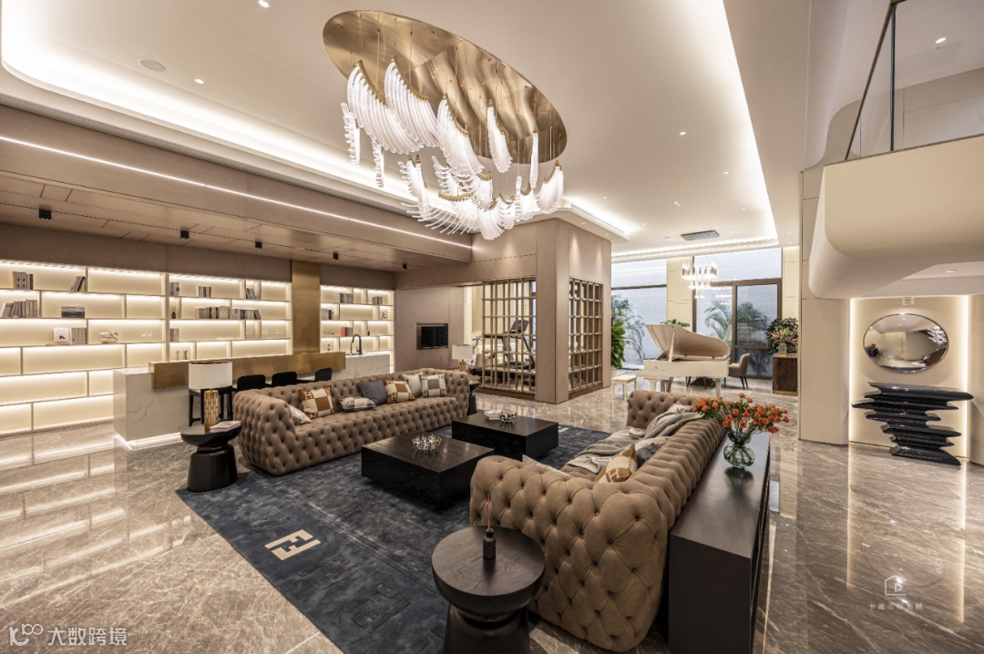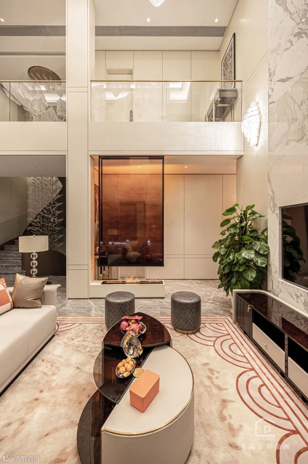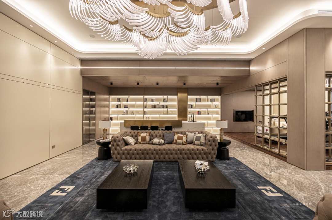 客厅进行了挑空设计,挑空高度 6.85 米,设计师认为黄铜元素是轻奢空间不可缺少的固定搭配,天生自带光效的金属质感与独特的造型唤醒整个空间氛围,起到画龙点睛的奇妙效果。
