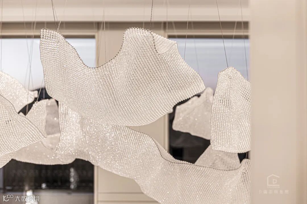 仿佛是一场古今对话,而 c 位的吊灯则是那个媒介。取形于齐白石的《借山图》,将那份恣意洒脱的画风凝固于此,似云似水,将那份珠海的柔情的海滨花园之感表达的淋漓尽致。
