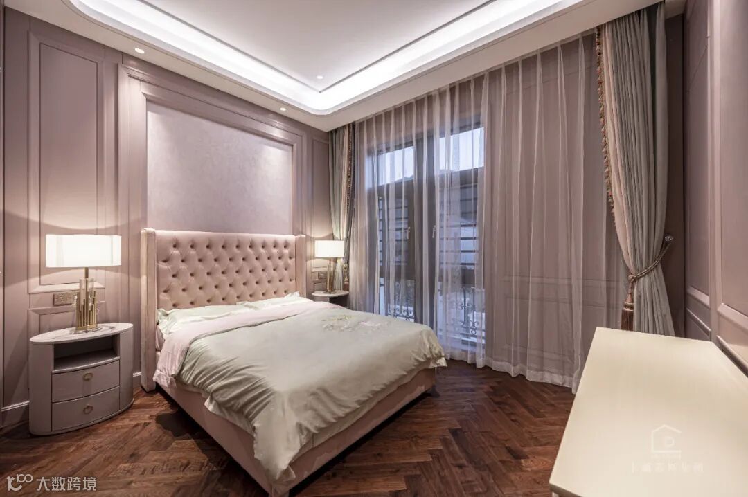 小公主的卧室以粉色为主打色系。灰粉色满足了小女孩的公主梦,又不会过分跳脱和主体设计割裂开来。无主灯的设计使整个空间不会有过分刺眼的光源,加上粉色窗纱营造了一个梦幻温馨的小窝。