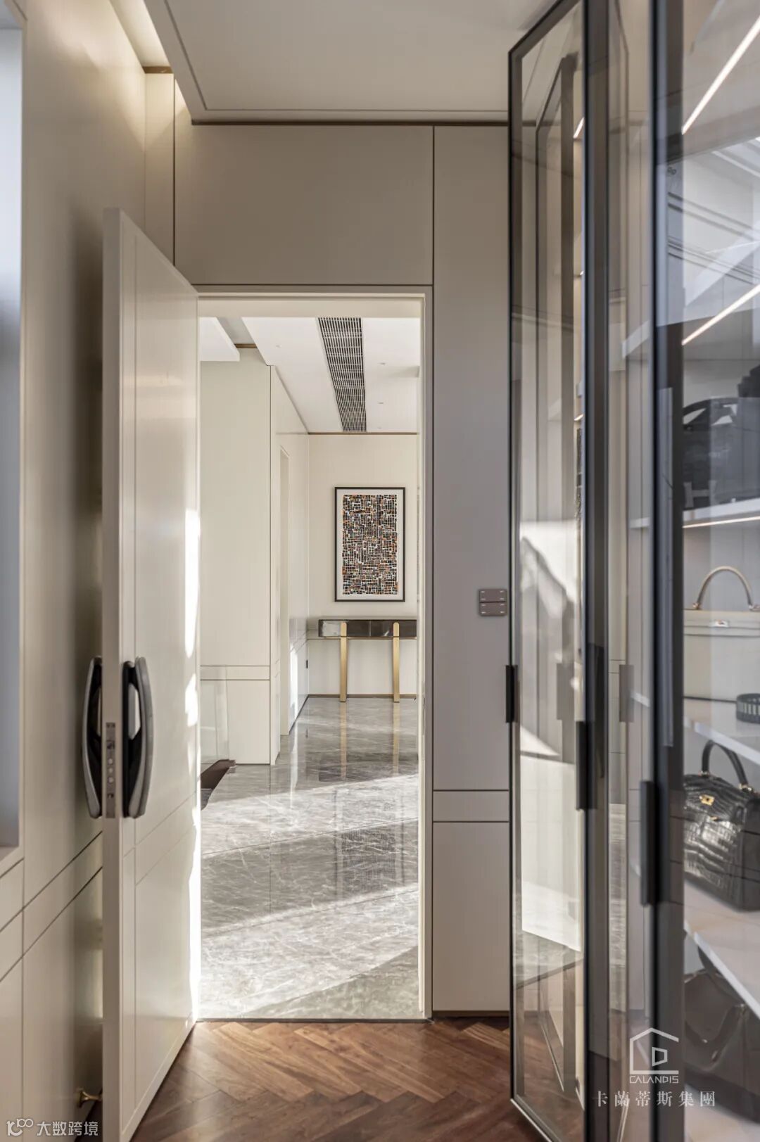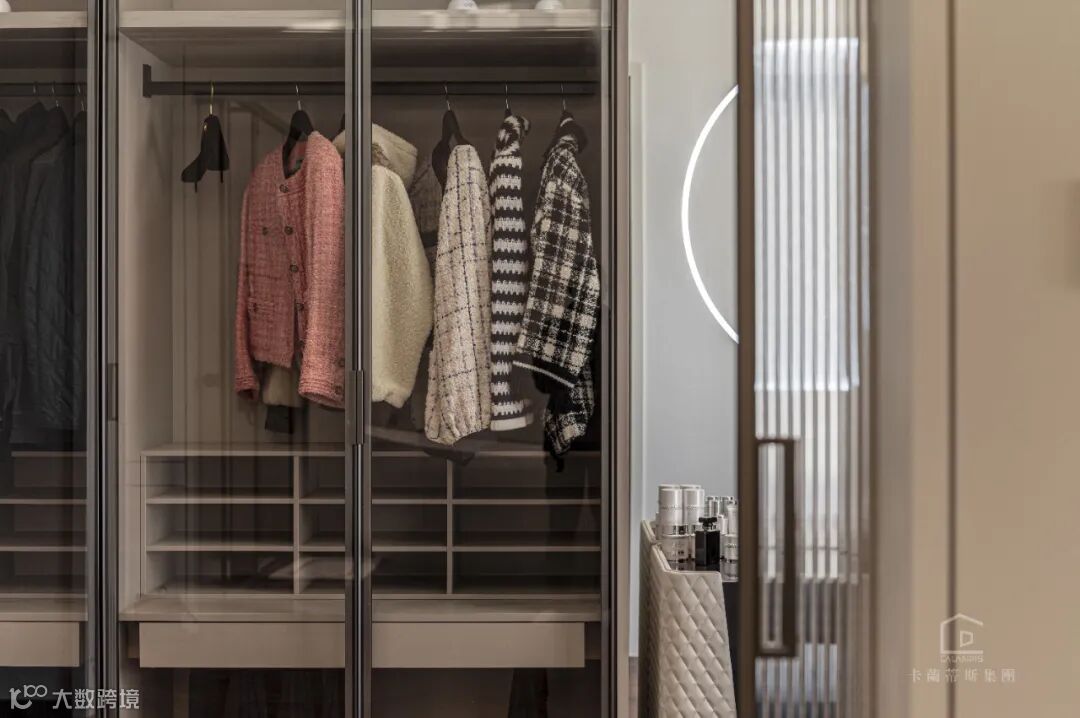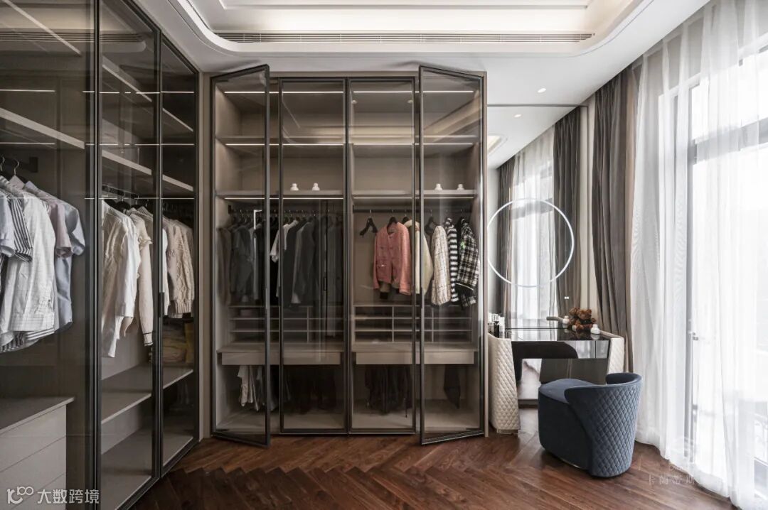 旁边进去就是衣帽间,同样采用透明的柜体,让内部衣物更加清楚明了,方便快捷找到自己的今日穿搭。旁边贴心的设置了全身镜,同时加上梳妆台,让精致的穿搭立马配对最适合的妆容。