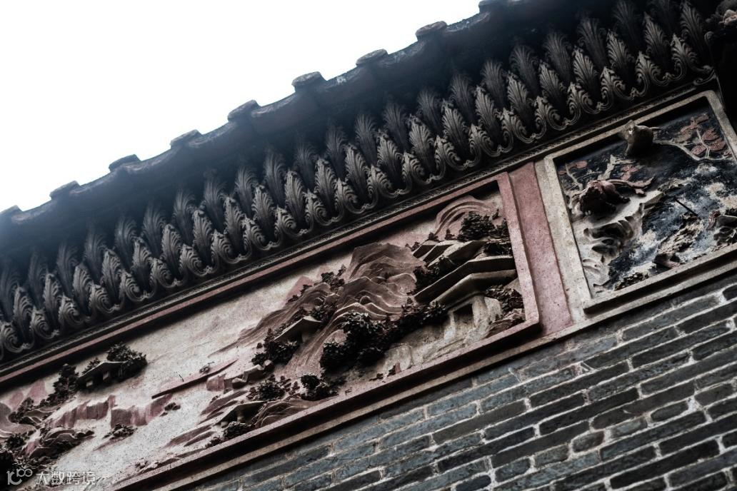 深井村肖兰凌公祠,建于清光绪六年(1880),博古脊上的灰塑,细腻生动,分外传神。外墙上方卷叶浮雕排列工整,玲珑剔透。院内巨大的照壁,后墙上有一幅灰塑山水画,塑有石榴牡丹各色花卉、鳌鱼、蝙蝠、狮子等吉兽,是少见的立体灰塑艺术精品,极为惊艳。