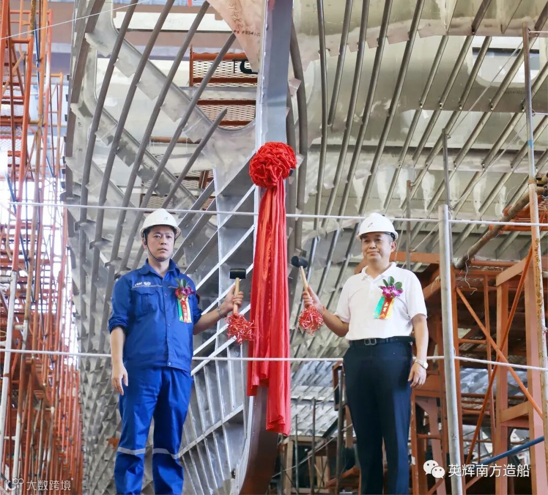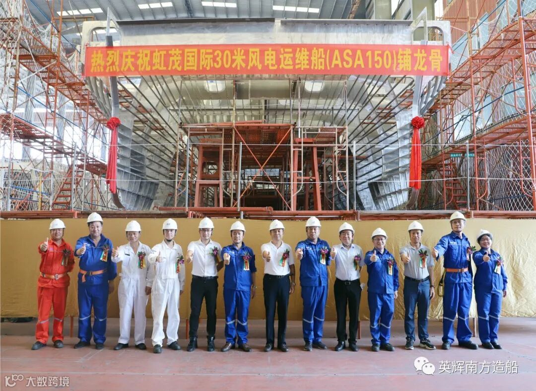 2023年9月20日,英辉南方为虹茂国际新能源科技(广州)股份有限公司设计建造的30米级风电运维船举行铺龙骨仪式。虹茂国际新能源科技(广州)股份有限公司董事长沈金华、总经理郭于贵,中国船级社广州分社入级检验处副处长韦文杰,英辉南方总经理陈晓亮出席仪式。