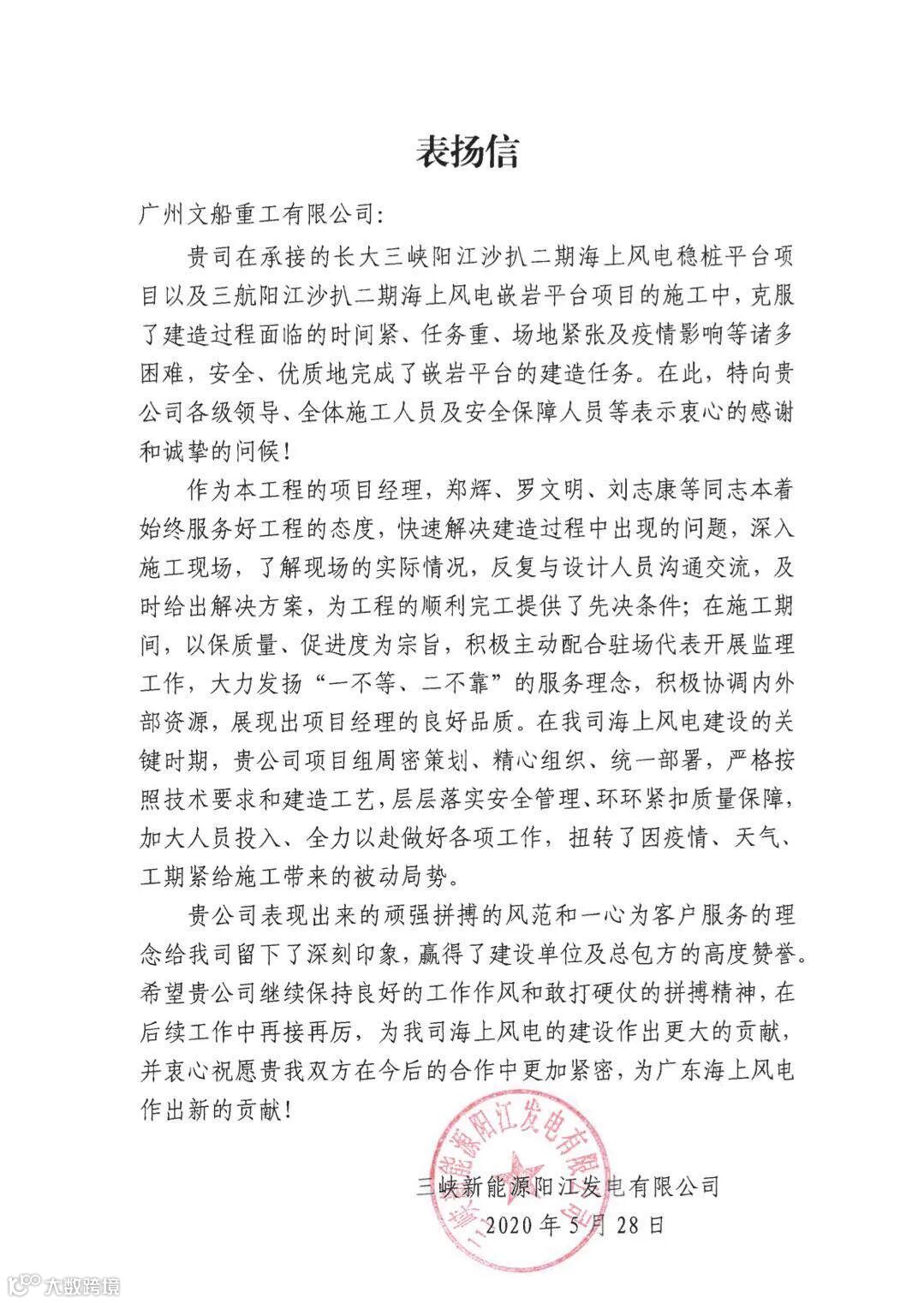 5月底,中国船舶集团旗下中船黄埔文冲船舶有限公司全资子公司——文船重工公司圆满完成保利长大阳江沙扒2稳桩平台首套施工平台及二套导向架项目、中交三航局嵌岩稳桩平台项目,自主研发的智能浇筑台车受到客户肯定,接到了来自保利长大工程有限公司、三峡新能源阳江发电有限公司的感谢信、表扬信。