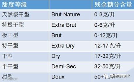 酿造香槟的最后一道工序是在去除瓶底的酒泥后往酒瓶中加入酒和糖分的混合物(Liqueur d’Expedition),这就是补液(Dosage),它决定了香槟的甜度。根据糖分的残留量,香槟可以分为天然极干型(Brut Nature)、特极干型(Extra Brut)、极干型(Brut)、特干型(Extra Dry)、干型(Dry)、半干型(Demi-Sec)和甜型(Doux)。现在,市面上大部分香槟都属于干型香槟。如果你觉得干型过于酸涩,不妨尝试一下半干型或者甜型的香槟。
