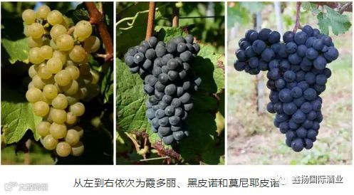 香槟透彻的酒液会令人以为它只能采用白葡萄品种酿造。实际上,它主要由三大品种酿制,包括霞多丽、黑皮诺(Pinot Noir)和莫尼耶皮诺(Pinot Meunier),后两者均是红葡萄酒品种。在酿造过程中,这些红葡萄品种在压榨后便会去皮,避免果皮给酒液带来色素。除了以上三大品种外,小美斯丽尔(Petit Meslier)、白皮诺(Pinot Blanc)和福满多(Fromenteau)也可以用来酿造香槟。
