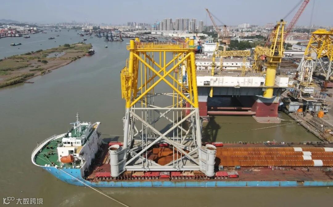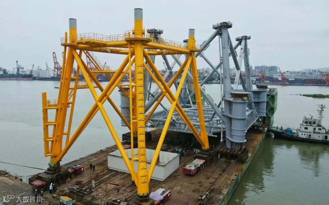 4月3日,中广核惠州港口一海上风电场项目海上升压站下大段、上大段在东莞基地码头顺利滚装上船,并运输到龙穴海工公司进行总组交付。本次运输的升压站长42.6米,宽54米、高62.6米、总重约2400吨,是华南地区目前最高、最大、最重的升压站。