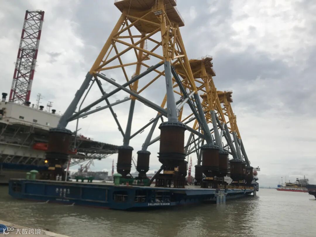 6月1日,装载着29#、28#、30#三套风机导管架的宏鲲玫瑰轮缓缓驶出南沙基地7#码头。